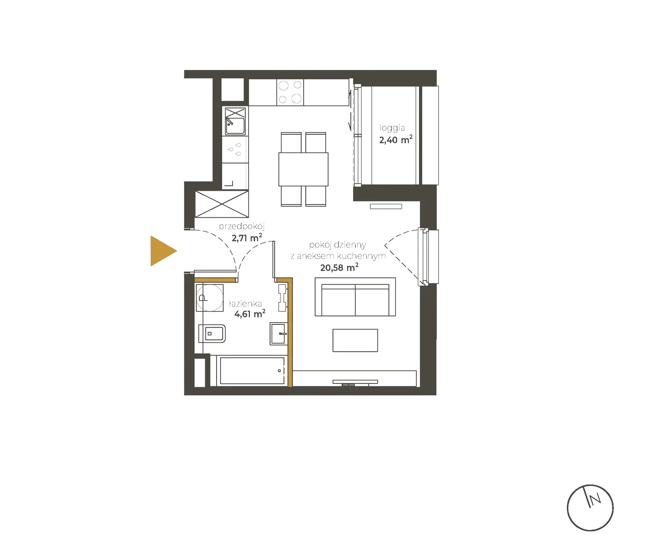 - Pokój dzienny z aneksem kuchennym 20.58 m²